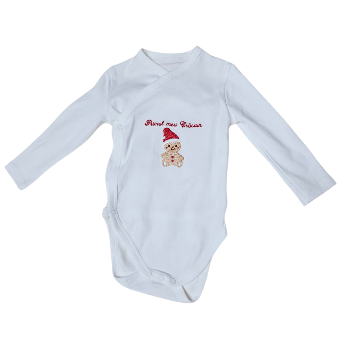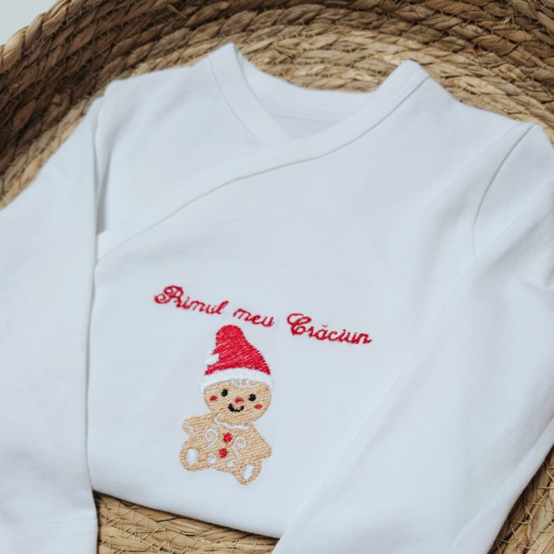 Pregătește-te pentru cele mai magice sărbători! Acest body pentru primul Crăciun al bebelușului de la Mikatelier este exact ce ai nevoie pentru a celebra prima întâlnire a micuțului tău cu magia Crăciunului. Cu un design super simpatic, având un om de turtă dulce în miniatură adorabil și mesajul festiv în limba engleză, acest body de Crăciun este vedeta oricărei ședințe foto de sezon.